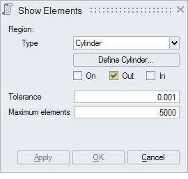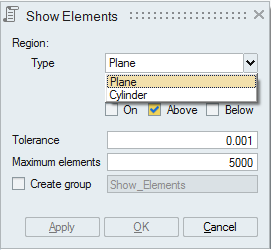This option displays the elements based on the defined region (Plane or Cylinder). First select the type of region to be defined.