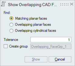 " Show " option is used to display the overlapping CAD faces between bodies. The overlapping CAD faces can be automatically stored in a face group. This is a temporary group and it will deleted during Redisplay or Reset.