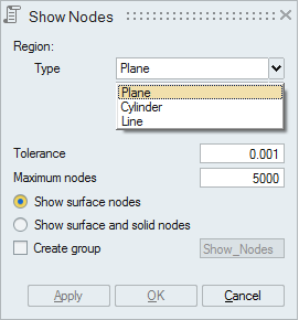 This option displays the nodes based on the defined region (Plane or Cylinder or Line). First select the type of region to be defined.
