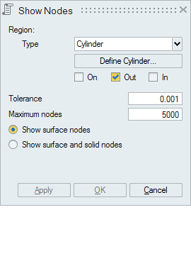 "Out" option displays the nodes that are lying outside (d > r + Tol) of the defined cylinder.
