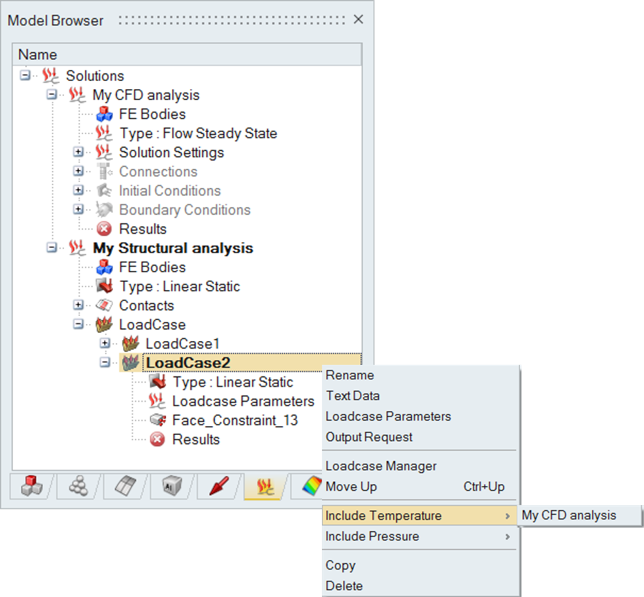 | Temperature | Heat transfer (steady state, non-linear or transient) analysis / flow steady state analysis | Linear / non-linear / normal mode analysis | Temperature load |