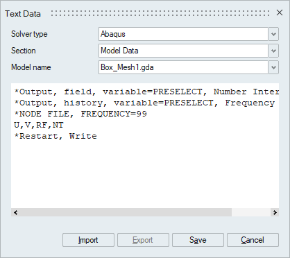 So that Abaqus or OptiStruct deck imported into SimLab and exported back will not have any data loss. The Text data is supported for Abaqus, OptiStruct, Permas, ADVENTURECluster, LS-Dyna and Ansys interfaces.