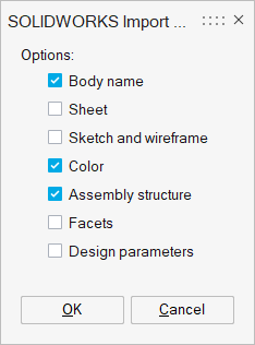 The assembly structure in the SOLIDWORKS files can be imported by enabling the Assembly Structure toggle. By default, when importing assembly structure, body names in SOLIDWORKS file will also be read. Refer the following link to know more about Assembly Structure.