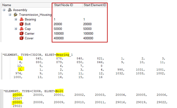 The Assembly browser contains columns to assign the desired start node and element IDs for the models / sub-models / bodies. The bodies get numbered using these values before writing the solver input file (Solution Name > Right Click > Export Solver Input File). It helps to always export the solver input file with the predefined ID ranges.