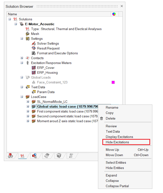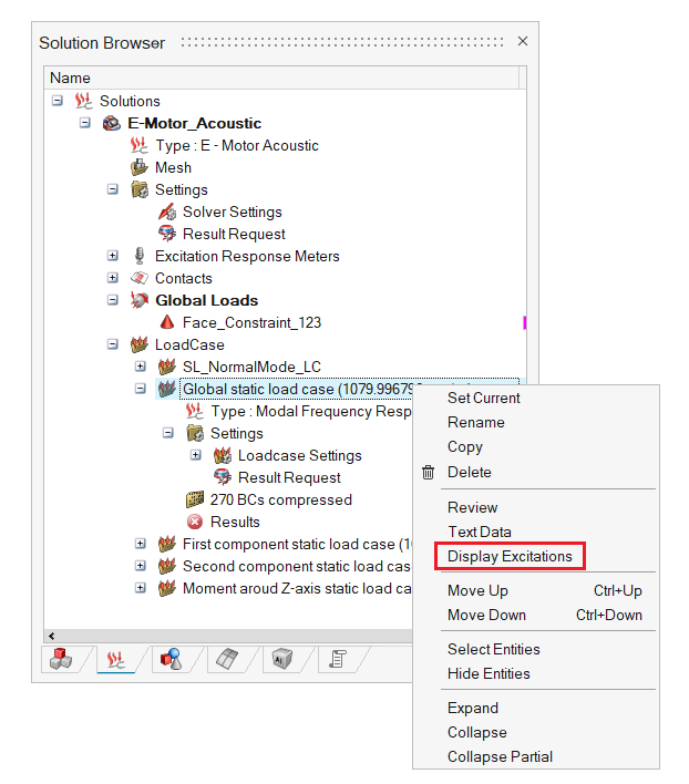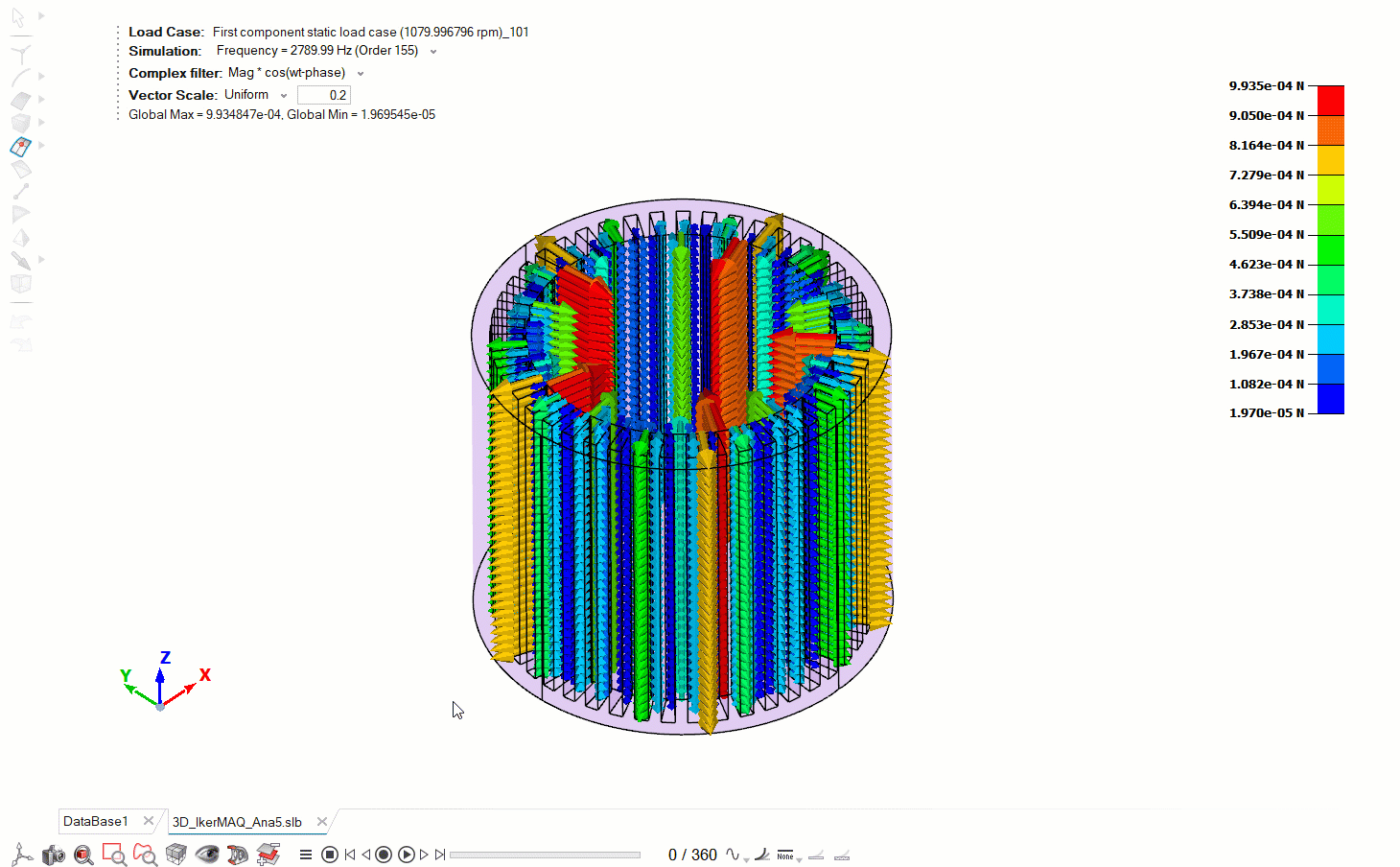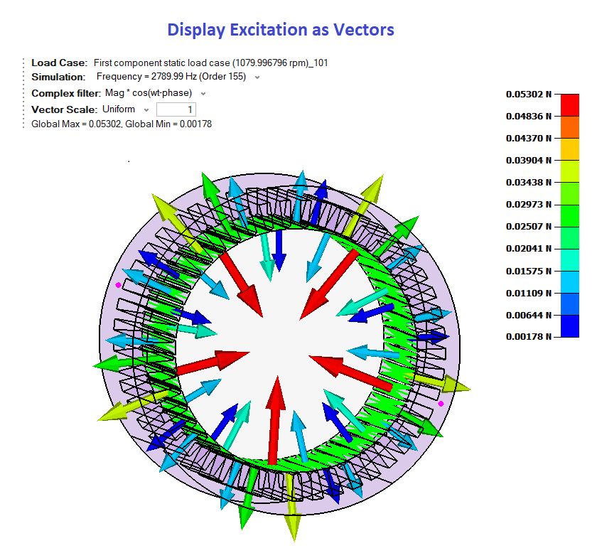 This option is used to visualize the excitation loads as vectors. Supported for the Modal Frequency Response, Direct Frequency Response, Coupled (Structural, Thermal and Electrical Analyse) and E-Motor Acoustic solutions with Optistruct solver.