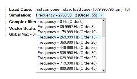 When excitations are displayed as vectors, all frequencies available in the selected load case are listed in the result panel and vectors are displayed based on the chosen options in the panel like frequency, complex filter and scale type.