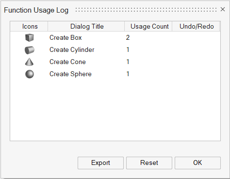 Function Usage Log will record the dialog usage count and undo/redo status. User can export the log file along with dialog title and usage count in CSV format using the Export option.