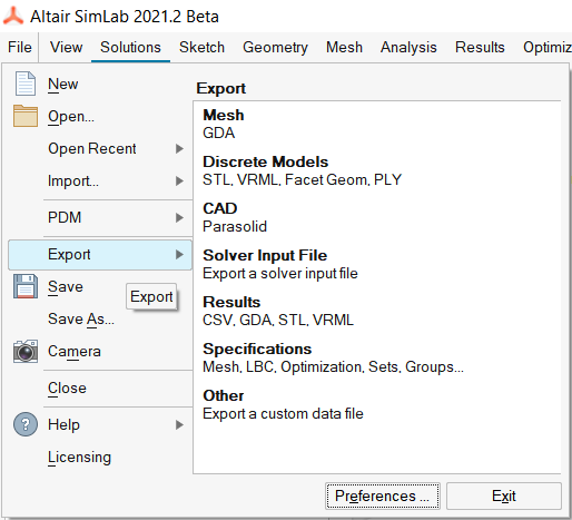 | Solve Input File | This option is used to export a solver input file. The supported formats are AcuSolve, ElectroFlo, Flux, Molding, nanoFluidX, OptiStruct, Radioss, Welding, Abaqus, Actran, ADVENTURECluster, Ansys, Converge, Femap, Fluent, LsDyna and Marc. |