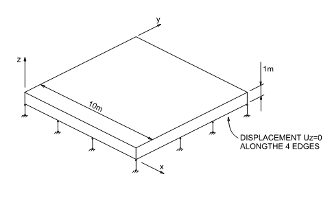 - Vertical constraints are applied not at the middle plane of the plate, but to the lower edges. This does not allow for clear separation of out-of-plane and in-plane vibration modes. This separation in NAFEMS results is because a very crude approximation is used. Also, in full 3D formulation the constrained edges are the source of a strong singularity in the solution.