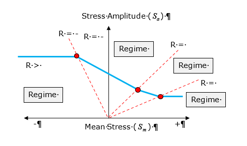 FKMのガイドラインに従い、応力比(R=Smin/Smax)の値を基準としてHaigh線図を4つの期間に分割します。次に補正値を使用して、損傷と寿命の計算段階で使用するSN曲線を選択します。