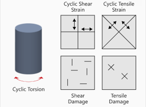 Figure 2. 繰り返しまたはねじりによるせん断ひずみ、引張引張ひずみ、せん断損傷、引張損傷