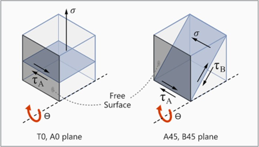 臨界平面法では、任意の損傷モデルを使用できます。その損傷モデルでは、損傷が最も激しい平面を検索する必要があります。考えられる損傷(破壊)モードには2種類があります。1つは引張による亀裂成長で、フリーサーフェスと直交する平面で発生します。角度θは、サーフェス上で確認された亀裂がσx方向に対して成す角度です。もう1つの破壊系は、せん断による亀裂成長で、サーフェスに対して45°を成す平面で発生します。この平面では、平面内せん断応力と平面外せん断応力の両方が考慮されます。θは、サーフェス上で任意の値を取ることができます。せん断応力τAは平面内せん断応力であり、サーフェス上で微小亀裂が成長する原因になります。最大平面外せん断応力τBは、フリーサーフェスに対して45°を成す平面上で発生し、サーフェスに向かって微小亀裂が成長する原因になります。Figure 3. 90°の平面における平面内せん断応力と法線応力 / 45°の平面における平面内せん断応力と平面外せん断応力