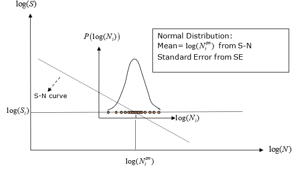 多くのプロセス同様、Log(N)の分布は正規分布であると見なされます。log(S)の特定の値に対してlog(N)が示すと考えられる値の全集合が存在します。この全集合の平均値が真の母平均となりますが、それを知ることはできません。したがって、入力したサンプルデータの平均値(SN曲線)とサンプルデータの標準誤差(SE)に基づいて、log(N)の真の母平均の最悪値を統計的に推測します。SNの材料データ入力は、そのデータの生成に使用した特定サンプルのばらつきが示す正規分布の平均に基づきます。