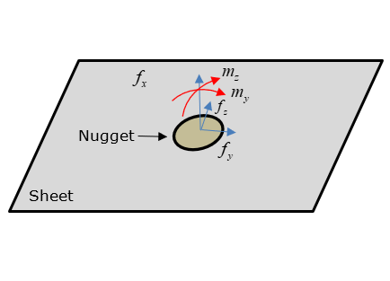 スポット溶接の疲労解析では、Ruppらの論文に基づき、独立した3つの位置であるシート2か所とナゲットでの溶接を検討します。ナゲットの位置で断面に作用する力とモーメントを求め、それらを使用して、シートとナゲットの位置でそれらによって発生する応力を計算します。つづいて、これらの応力を使用し、レインフローカウントとSN法によって疲労損傷を計算します。