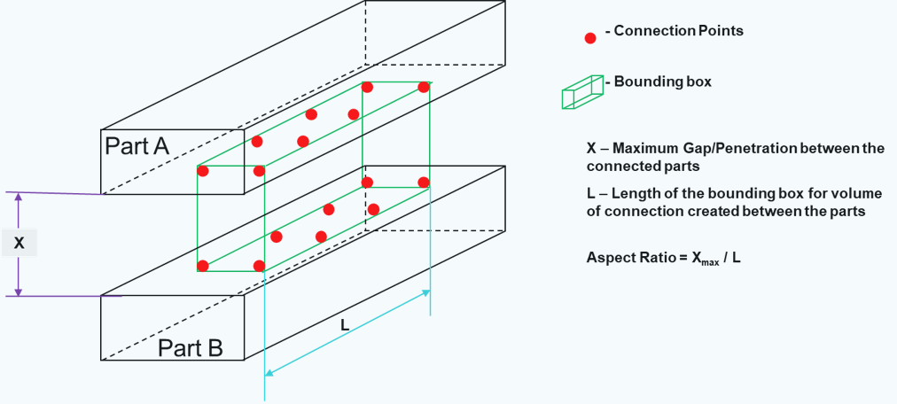 - この比率は、結合されたパートが十分な接続点を持つかどうかを示すものです。これは、結合されたパート間に関連する最大ギャップ/貫通に基づくものです。結合レビューのためのアスペクト比は、以下のように計算されます。