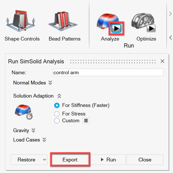 Inspire構造リボンの解析ツールで、実行SimSolid 解析を選択します。