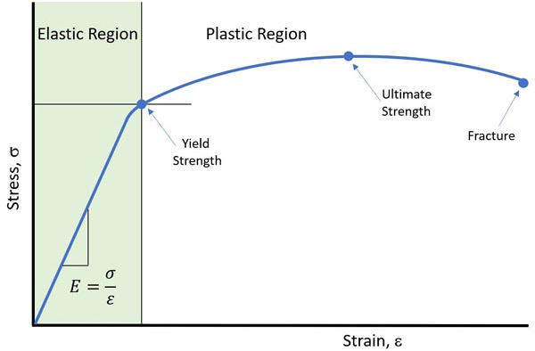 SimSolidによる構造解析では、応力ひずみカーブの線形弾性領域に材料がとどまることを前提としています。つまり、ひずみが小さいこと(0.2%未満)、荷重や時間で材料特性が変化しないことを仮定しています。図 1.