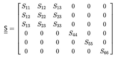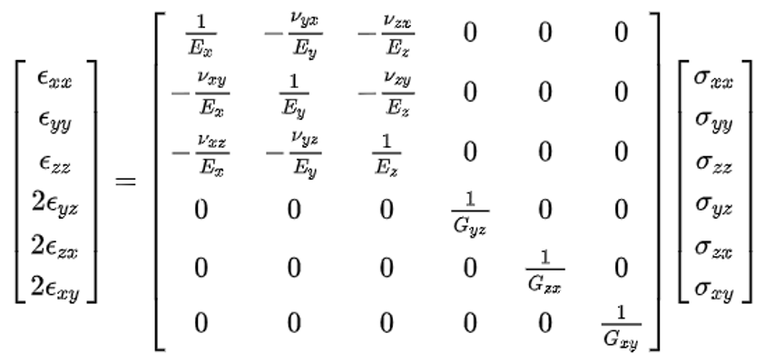 - 直交異方性材料は、その材料特性において、相互に垂直な3つの対称面を持ちます。直交性線形弾性材料の応力-歪み関係は、以下のようになります。コンプライアンス行列 は以下のように与えられます: