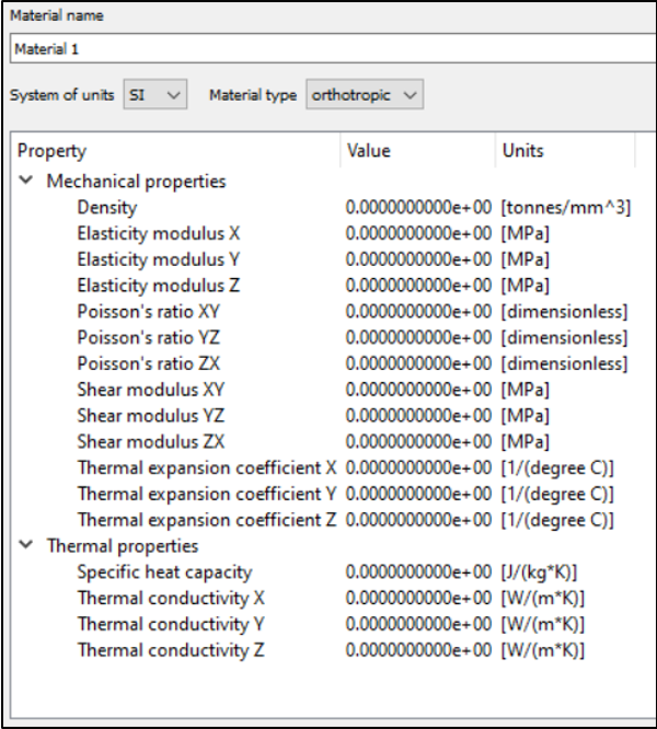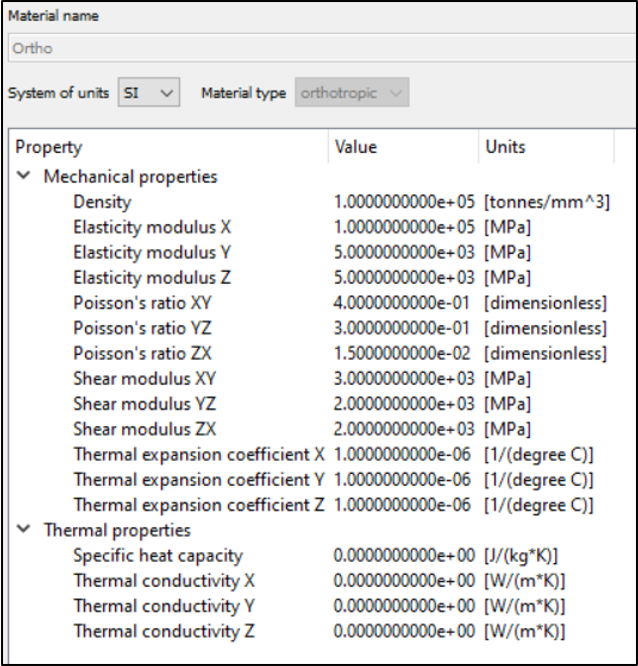 - 熱解析に必要な場合は、熱膨張係数(X、Y、Zに沿った)、熱プロパティを与えます。
