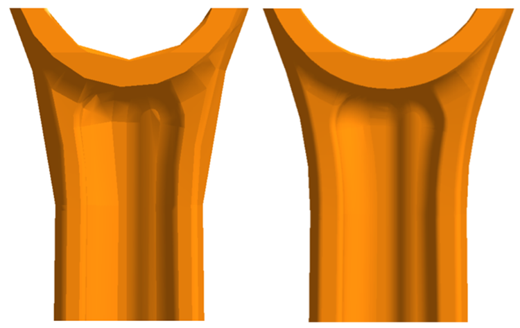 下図の左側は、粗いファセットを持つモデルです。このような低解像度の表現では、曲率の重要な詳細が見逃され、しばしば非現実的な応力集中や特異点が生じます。ジオメトリがうまく表現されておらず、重要なフィーチャーが見落とされている可能性があります。