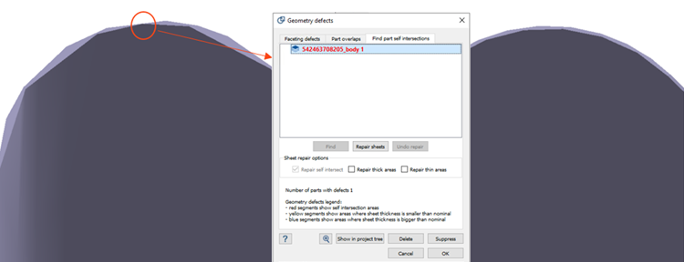 上の図は、板厚にばらつきのある領域(公称値よりも薄い部分や厚い部分がある)、および自己交差の例を示しています。これらの問題はすべて SimSolid内で対処できます。