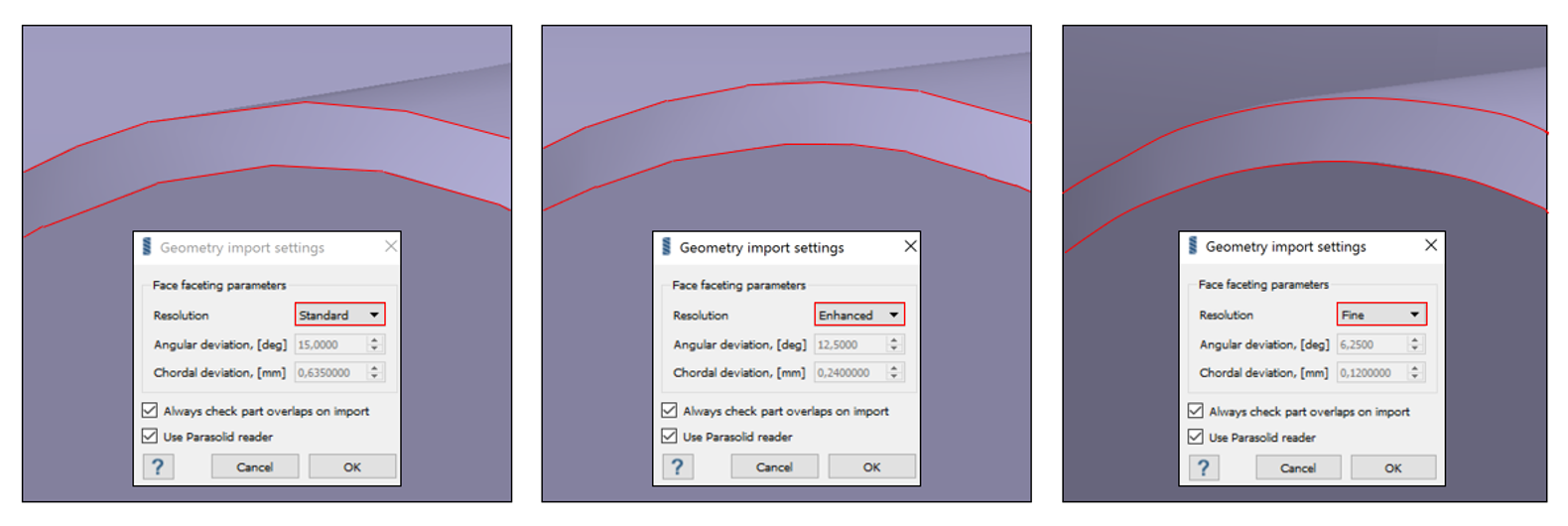 - 応力解析では、不正確な応力集中につながる粗いファセットを避けることが重要です。このような場合は、より詳細で正確な解像度を確保するために、解像度は「中間」または「細かい」に設定を選択することをお勧めします。しかし、主な目的が剛性を評価することであれば、ほとんどのケースでは標準(Standard )のインポート設定で十分であり、より効率的です。