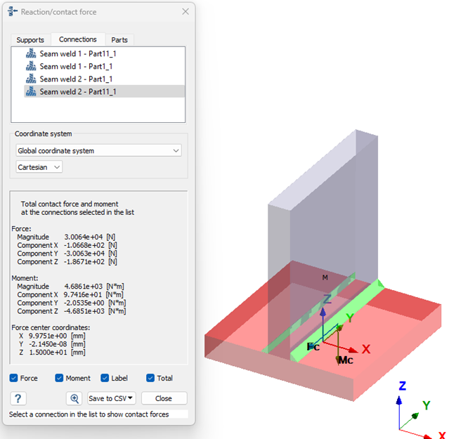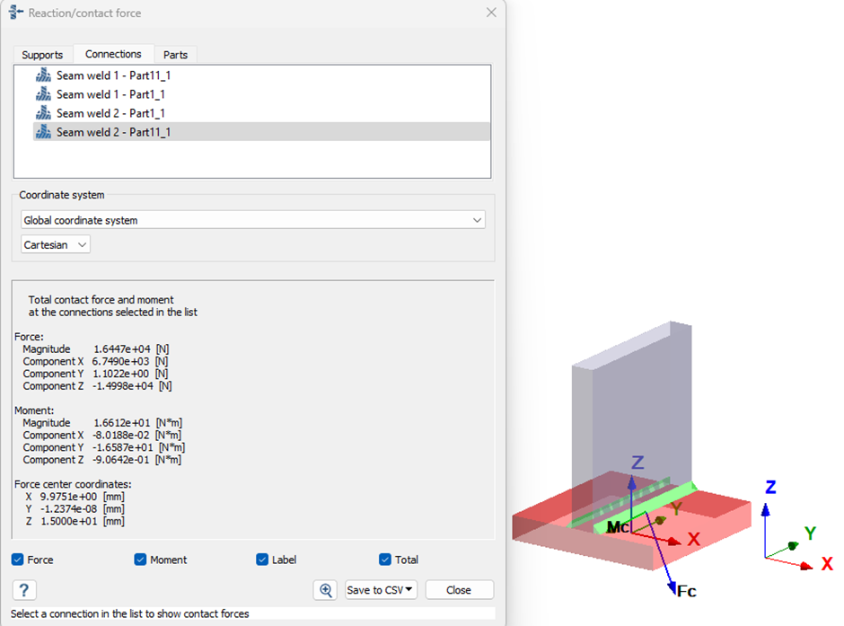 溶接部の1つに対する力とモーメント成分は、下図のように反力/接触力ダイアログから取り出されます。