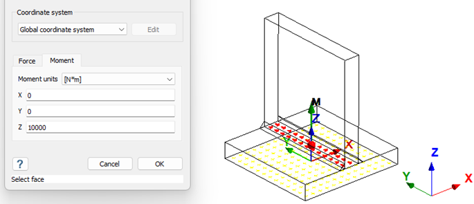 両側すみ肉溶接で梁をつなぐ溶接のスロートに沿った応力成分を計算します。下図のように垂直な板の底面に、z軸方向に1e7N・mmのモーメントを加え、底板で拘束します。