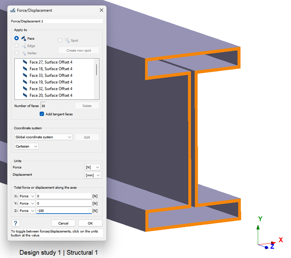 - Z方向の力には-100 N(圧縮荷重)を入力します。
