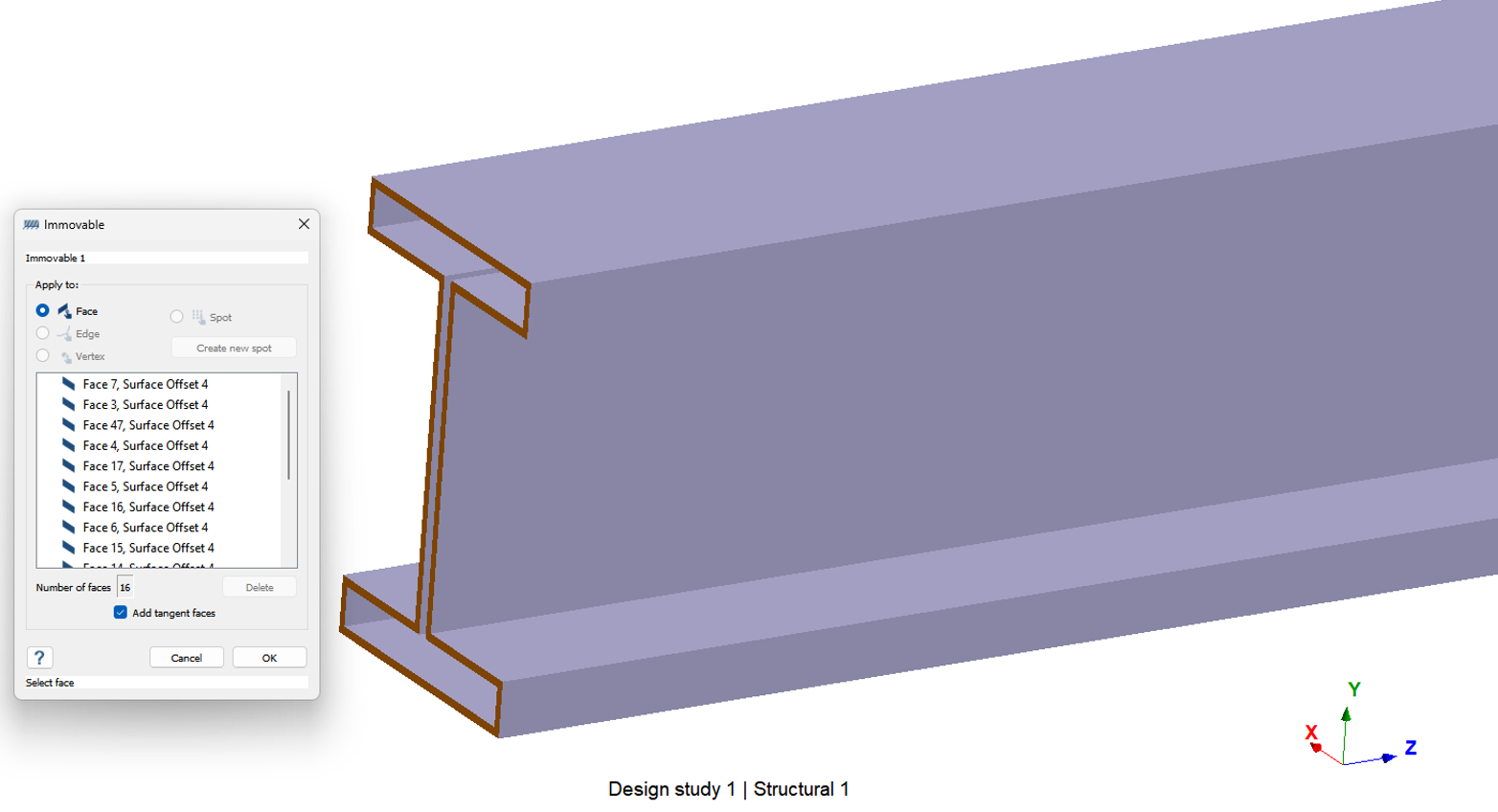 新しい解析(Structural 1にリンクされたStructural 1)がDesign study 1の下のプロジェクトツリーに表示され、解析ワークベンチが開きます。 - ダイアログで、Structural 1を選択します。
