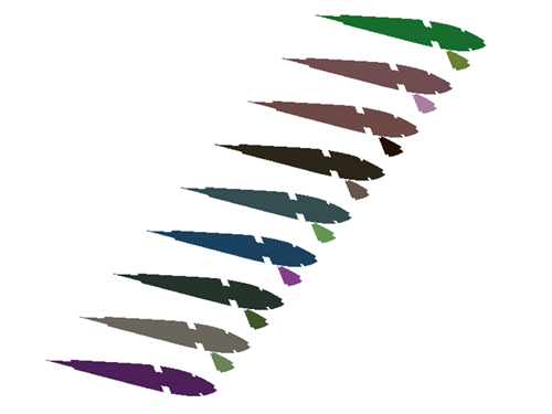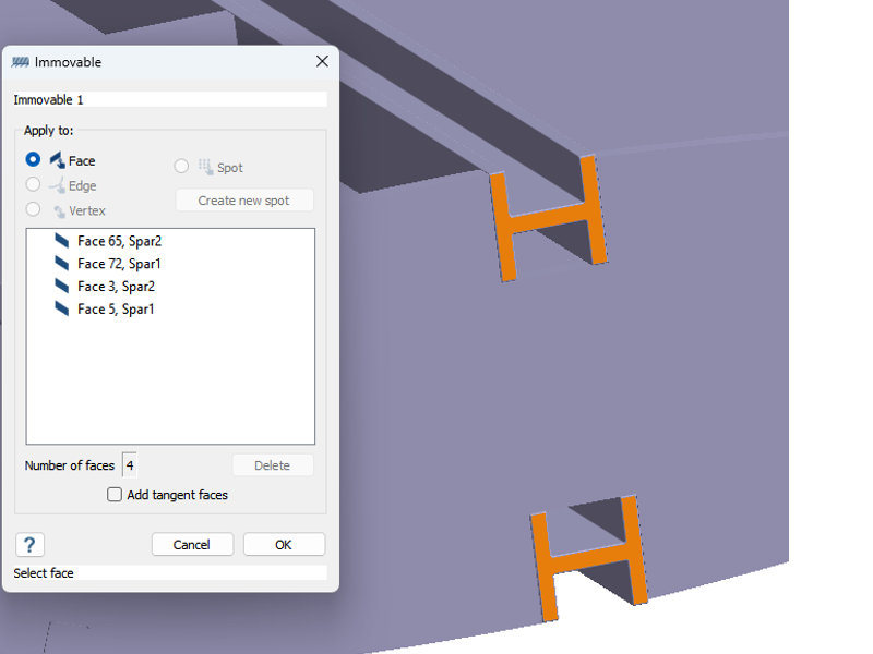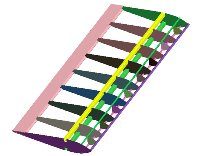 Figure 1は、このチュートリアルで使用する翼パネルのモデルです。翼パネルのリブはCADサーフェスとしてインポートされます。このチュートリアルでは、翼パネルのリブ用のラミネートを作成します。