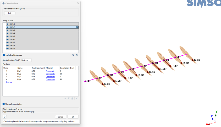 - ラミネートの作成ダイアログでスキンを追加するには、プロジェクトツリーまたはモデリングウィンドウのRibs1からパートを1つ選択します。