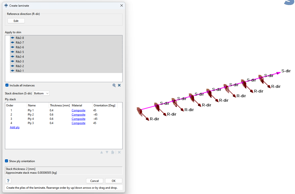 - ラミネートの作成ダイアログでスキンを追加するには、プロジェクトツリーまたはモデリングウィンドウのRibs2からパートを1つ選択します。