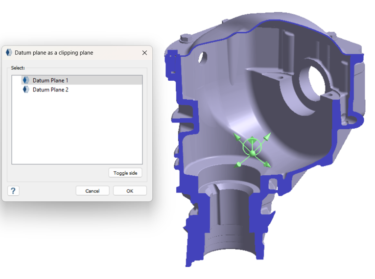 Note: OKをクリックするとダイアログは閉じますが、クリッピングプレーンは残ります。クリッピングプレーンを非アクティブにし、モデルを全体表示に戻すには、