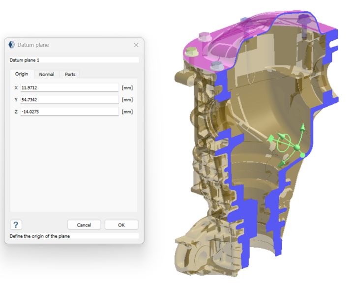 原点タブで、データム面の原点の値(0,0,0)を入力するか、モデリングウィンドウのマニピュレーターで移動します。