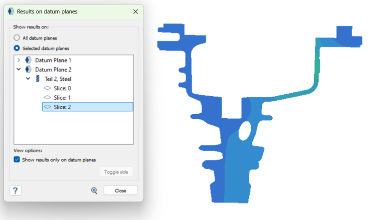 ダイアログで各データム面を展開し、関連するパートを確認します。さらに拡大すると、各パートのスライス数が表示されます。スライスを個別に選択すると、そのスライスのコンターを視覚化できます。