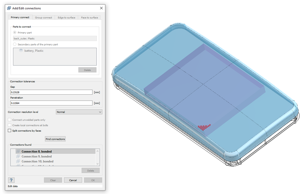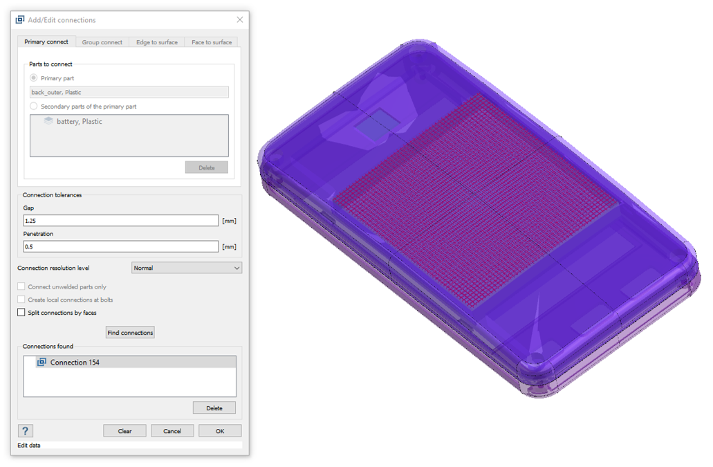 結合の追加/編集ダイアログが開きます。ギャップと貫通のトレランスと結合解像度の設定が一覧表示されます。図 6.
