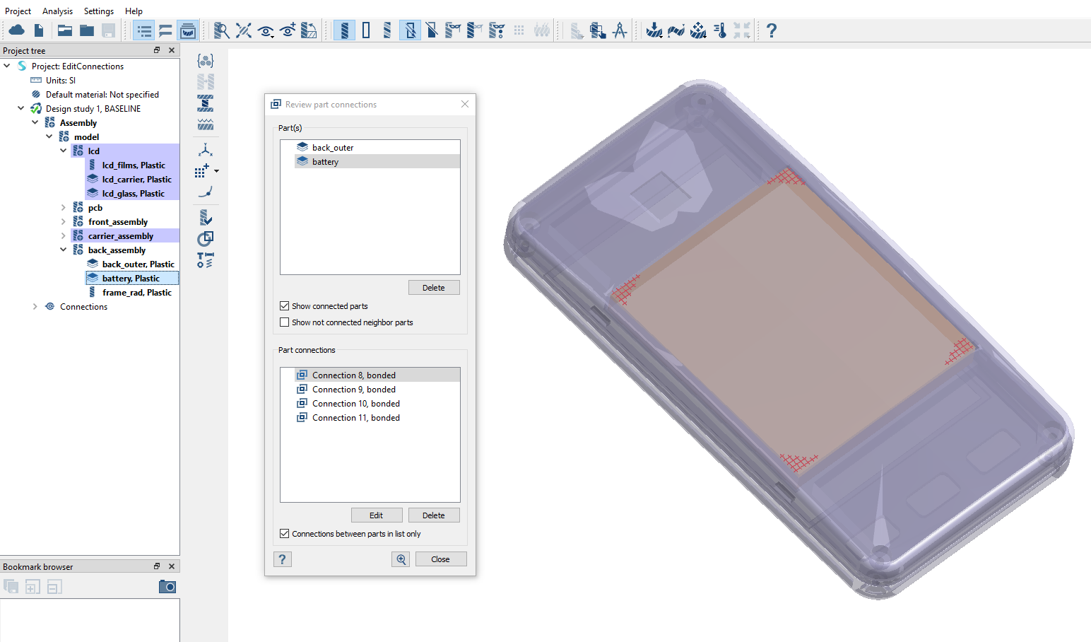 選択したパート間の既存の結合はすべて、プロジェクトツリーおよびレビューダイアログで赤でハイライトされます。