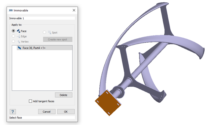 新しい拘束Immovable 1がプロジェクトツリーに表示されます。拘束の可視化表現がモデル上に表示されます。