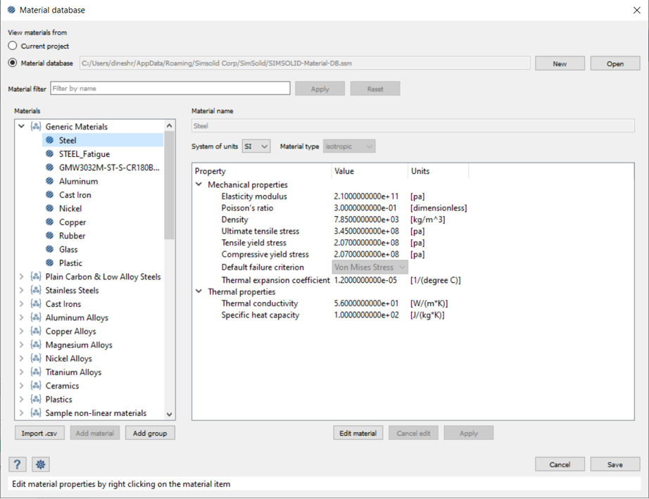 名前がSTEEL(大文字と小文字が区別されます)である材料がSimSolidで使用可能であることを確認します。