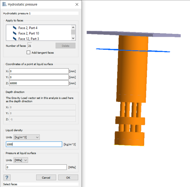 液体表面インジケーターがモデルに表示されます。ヒント: このインジケーターの中央にある球を使用して液体表面を配置することもできます。 - 液体密度に1000と入力します。