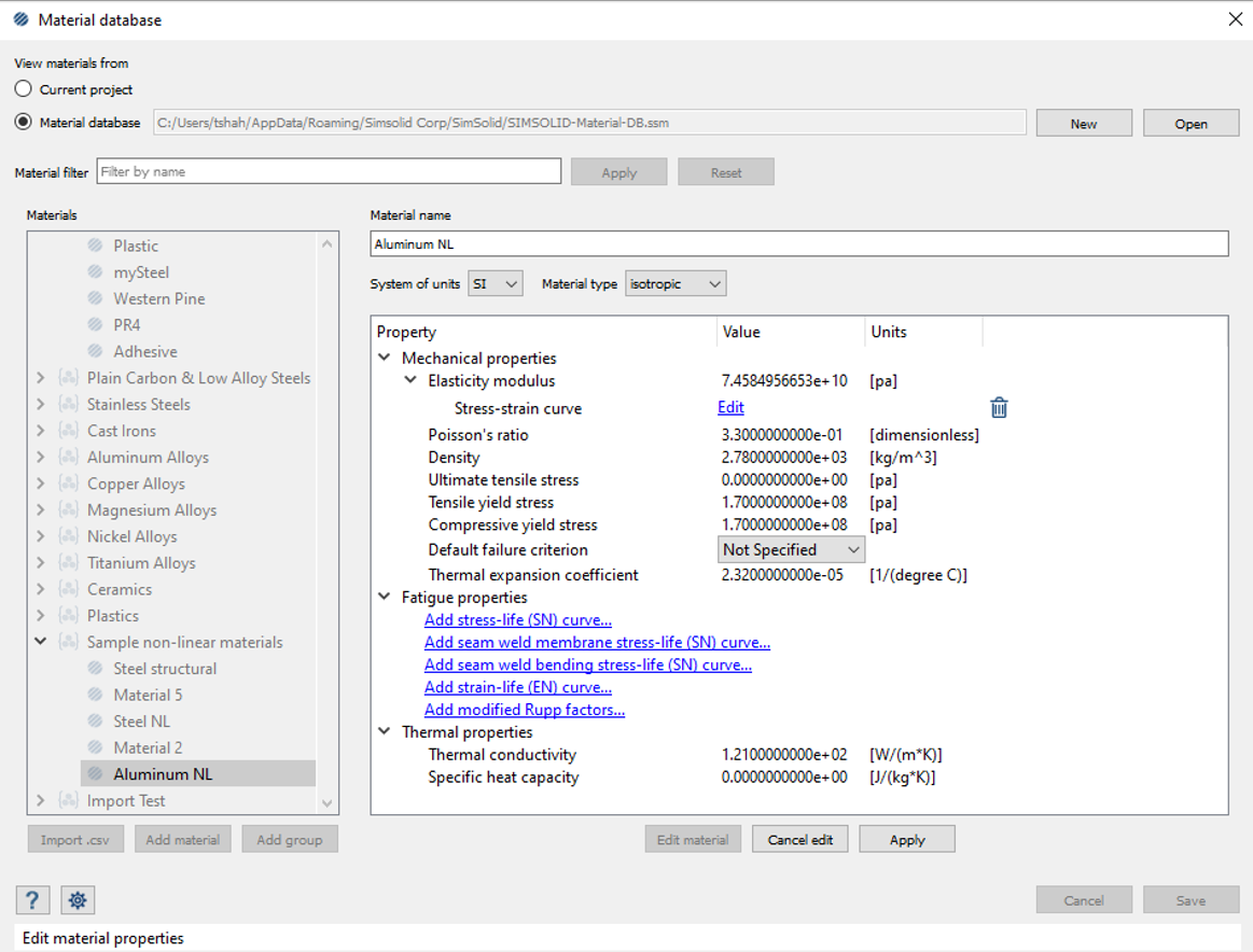 Edit Material databaseダイアログでは、インポートした応力-ひずみ曲線から計算された弾性係数を確認できます。