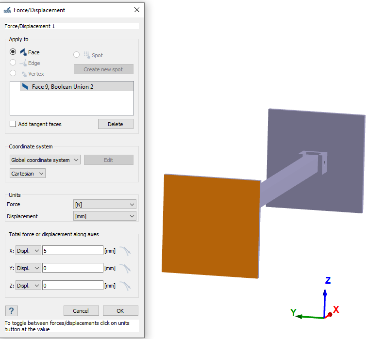 - 各方向のドロップダウンメニューで荷重タイプを変位に変更します。