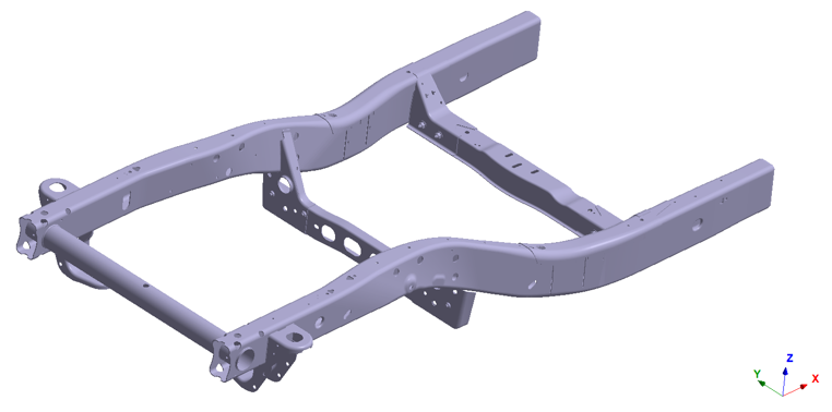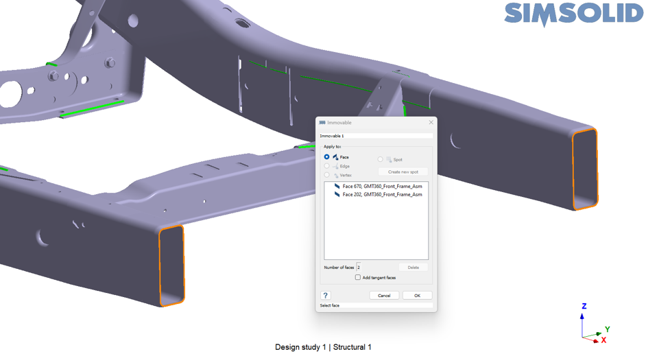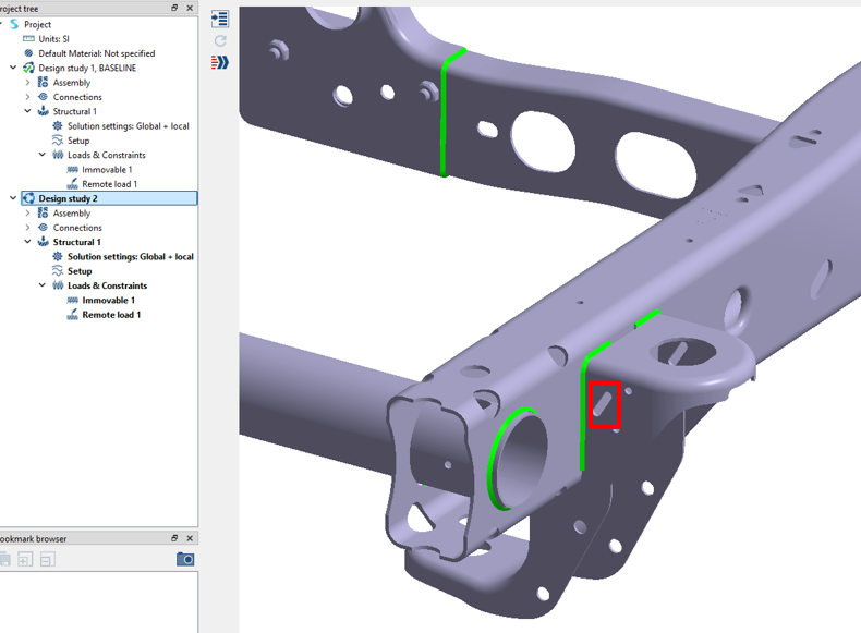 材料は新しいパートに引き継がれ、通常の溶接とシーム溶接の結合は前回の設計スタディ 1から引き継がれました。荷重と制約も設計スタディ 1から引き継いでいます。この設計変更は、ブラケットの剛性を変えることなく、シャーシ全体の重量を減らすことを意図したものです。