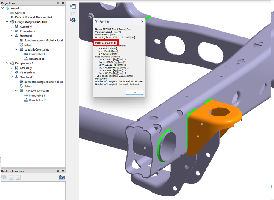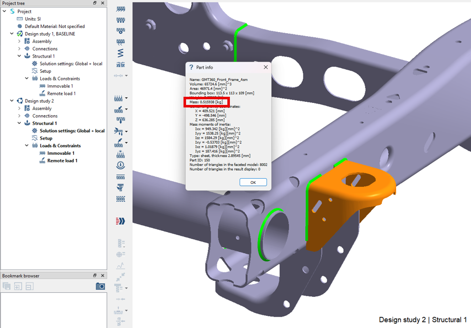プロジェクトツリーで、設計スタディ 2 の置換されたパートを右クリックし、情報を選択してパートの質量を表示します。