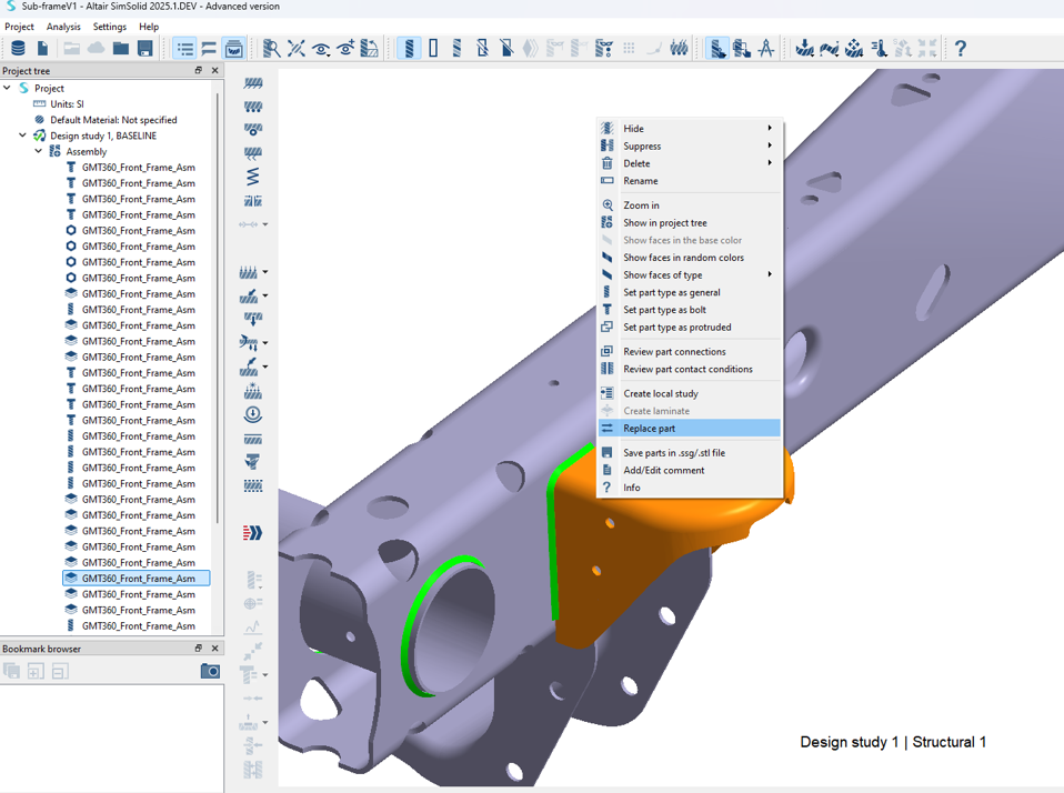プロジェクトツリーまたはモデリングウィンドウから、交換するパートを右クリックし、