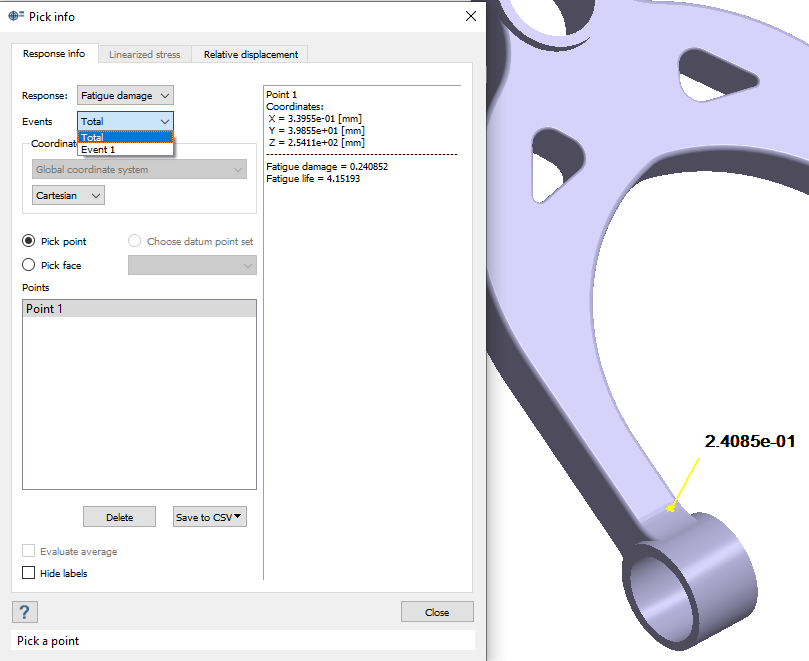 選択情報ダイアログのイベントで、ドロップダウンメニューからトータルを選択して累積損傷を表示するか、関心のある個々のイベントを選択します。