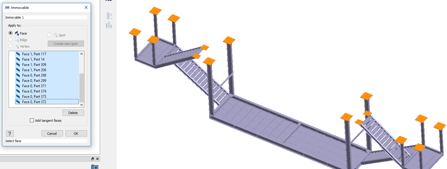 新たに、完全拘束 1がプロジェクトツリーに表示されます。拘束の可視化表現がモデル上に表示されます。