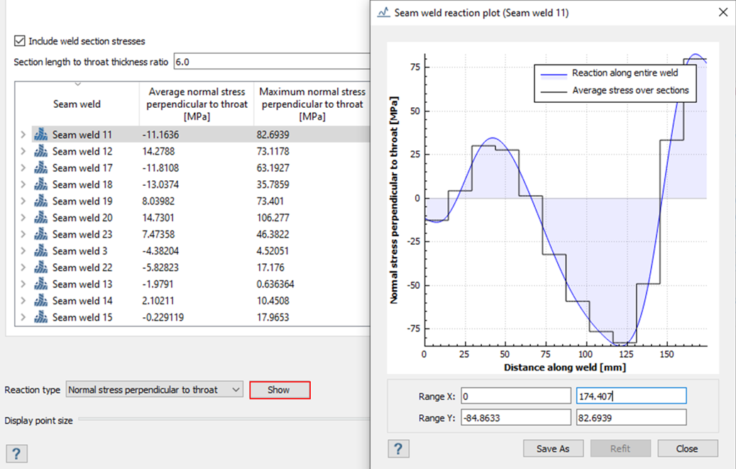 ダイアログで溶接部の応力を含むを有効にして、断面の長さとのど厚の比を6.0に設定します。これで、この比率に基づいて応力に対するシーム溶接反力が評価されます。