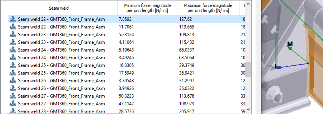 リストから溶接を選択し、モデリングウィンドウに力とモーメントの方向を表示します。選択した溶接の位置にズームインするには、
